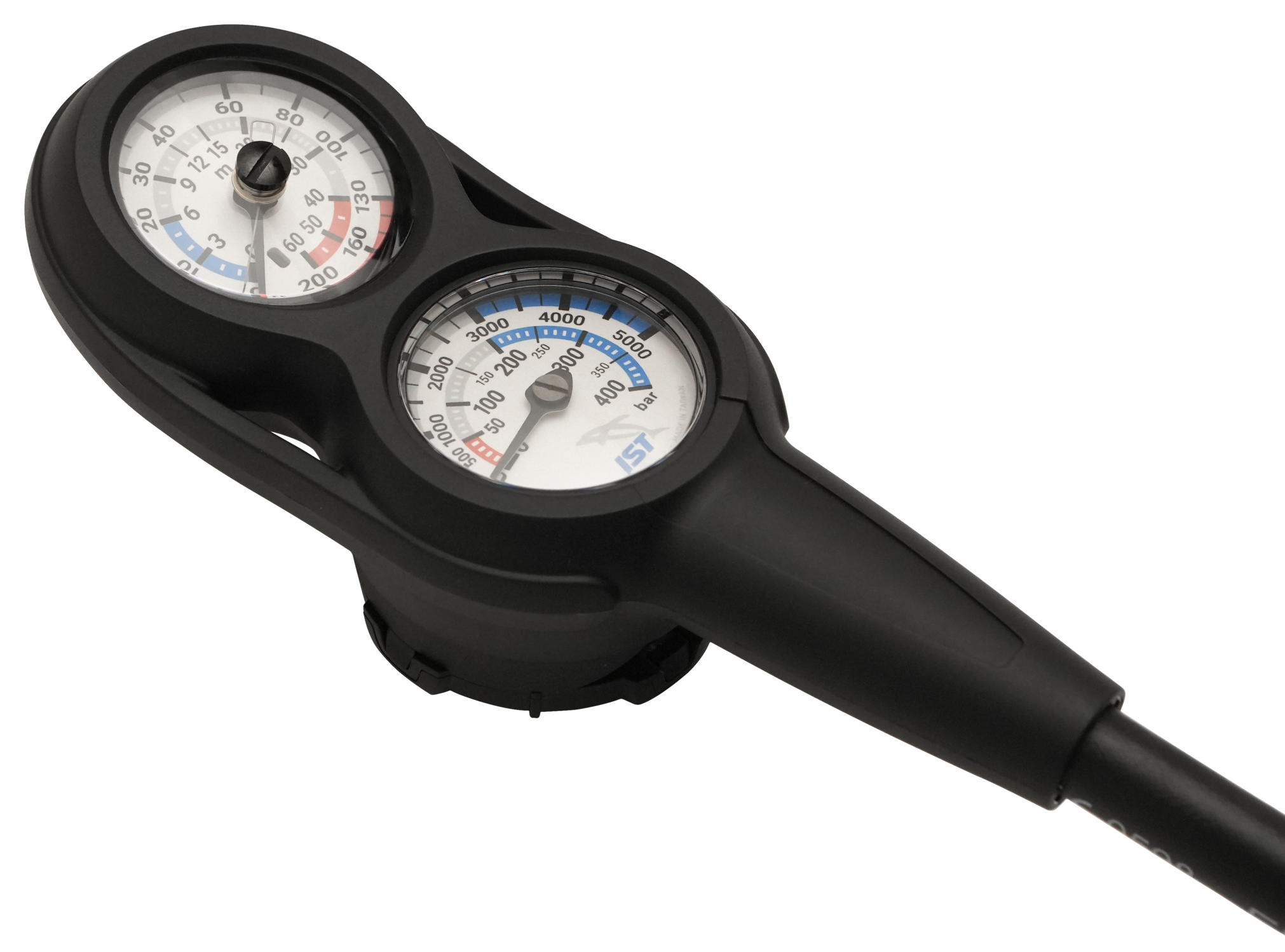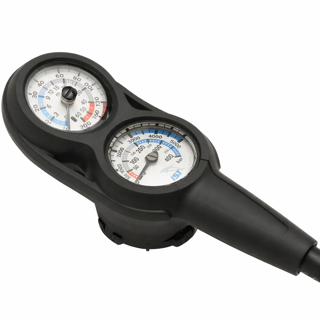 - Integrated 60-meter / 200ft depth gauge and 400 bar / 5000 PSI pressure gauge with dual scale display